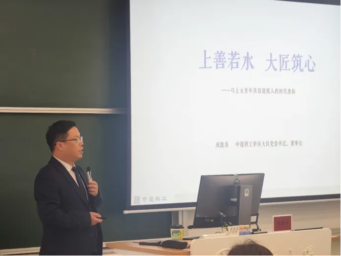 为深化产教融合、精准对接行业需求,助力学子明晰职业方向、锤炼专业本领,12月12日下午,太阳成集团tyc33455cc特邀资深工程管理专家、中建科工华东大区党委书记、董事长成能名先生,进行《上善若水 大匠筑心——与上大青年共话建筑人的时代坐标》专题分享。公司党委书记吴铭,党委副书记、副经理陈中元与百余名力工学子共同参与,沉浸式感受行业前沿脉动与工匠精神的时代内涵。